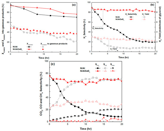 Time on stream experiments for Ni/Al2O3 and Ni/AlCeO3 catalysts: (a) Total glycerol conversion and glycerol conversion into gaseous products, (b) H2 selectivity and yield, (c) CO2, CO and CH4 selectivity (samples tested under experimental protocol #2).