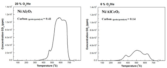 The TPO results for both catalysts are presented in Figure 10. As a first observation, significantly more carbon was deposited on to the Ni/Al2O3 catalyst (0.41 gcoke/gcatalyst) in comparison to the Ni/AlCeO3 sample (0.14 gcoke/gcatalyst). The Ni/Al2O3 catalyst shows a weak peak at 470 °C and two broad peaks at 550 °C and 650 °C, which indicate the existence of different co-existing carbon allotropes. For the Ni/AlCeO3 catalyst, there is a clear peak at ~375 °C, whereas a larger peak at 490 °C is observed; this points to the existence of coke that contains a higher fraction of defective carbon, which is known to be more easily oxidized. In addition, the high temperature decomposition peak appears as one single thermal event centred at 625 °C, i.e., slightly lower than the corresponding peak of the Ni/Al2O3 catalyst. It has been reported that the thermal decomposition of physisorbed carbonaceous products, termed as soft (or amorphous) coke, occurs at temperatures between 200 and 500 °C [39], while the gasification of hard coke (comprising of bulky carbonaceous species and often referred to as filamentous carbon) [72,73,74] takes place between 500 and 800 °C.