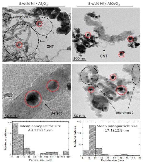 Figure 12 presents representative TEM images of the two spent catalytic samples and the corresponding particle size distribution histograms. The images confirm the formation of different carbon allotropes on the catalytic surface (indicated by black dashed circles), but also show heavy filament formation on the Ni/Al2O3 system, in excellent agreement with the discussion above. Encapsulating carbon can also be observed in the lower image for this system (examples of Ni particles are shown by red dashed circles), which is known to lead to a loss of activity as the Ni particle is no longer available during the reaction. Moreover, the particle size distribution histograms show that the mean Ni size of the Ni/AlCeO3 catalyst is substantially smaller than that of the Ni/Al2O3, helping to explain the improved activity and stability characteristics of the former sample.