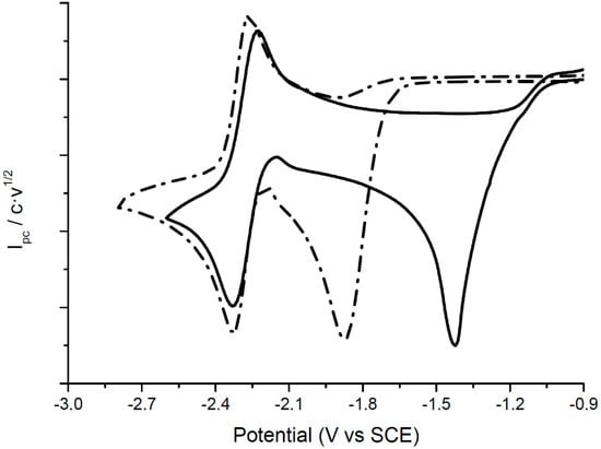 Cyclic voltammograms (CVs) of a 10 mL solution of 1 in dimethylformamide (DMF) using 0.10 M of tetrabutylammonium tetrafluoroborate (TBA BF4) were recorded at different scan rates (from 0.10 a 1.0 V s−1) using glassy carbon (GC, dotted line) and Ag (solid lines) as working electrodes under a N2 atmosphere, and are depicted in Figure 1. The same general trend was observed in both cases, a first two-electron irreversible wave followed by a second reversible one-electron wave. This second electron transfer corresponded to the electrochemical reduction of benzonitrile, which is in agreement with previous studies reported in the literature under similar experimental conditions [36]. A closer look at the CVs revealed that the reduction potential value of 1 was reduced by at least 0.46 V (from −1.83 V to −1.37 V), when Ag was used as cathode material instead of GC. The reduction of the over-potential showed a well-defined electrochemical signal (Figure 1). Hence, the use of silver as a cathode introduced electrocatalytic properties for the current reduction processes performed in an aprotic organic electrolyte, such as DMF + 0.10 M TBA BF4.