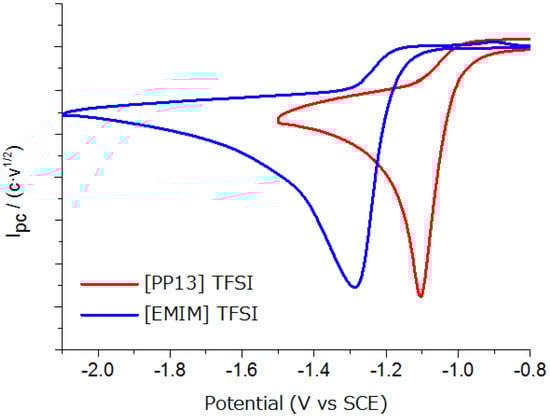 Due to the low conductivity and larger viscosity of RTILs (Room Temperature Ionic Liquids), in order to facilitate the direct comparison between the cyclic voltammograms in the different media, the current values obtained were first normalized by the concentration and the scan rate (Ip/cv1/2). Later, those values were also normalized and the relationship between the four solvents can be expressed by a total normalization coefficient. This coefficient can be expressed as a ratio between DMF/[EMIM]TFSI, DMF/[PP13]TFSI, DMF/[N1114]TFSI, and DMF/[BMPyr]TFSI 3.0, 1.7, 6.0, and 2.7, respectively.