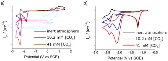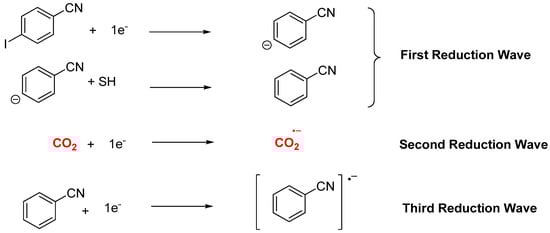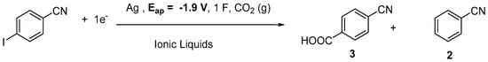 The CV of 1 at the silver cathode under a CO2 atmosphere in DMF showed three reduction peaks at −2.23 V, −2.09, and −2.40 V vs. SCE. The first and third peaks corresponded to the electrochemical reduction of 1 and benzonitrile, respectively. The second peak corresponded to the electrochemical reduction of CO2. This assignment of the second reduction peak to the electrochemical reduction of CO2 can be confirmed since the peak current value was directly linked to the CO2 concentration, as it can be seen in Figure 4b. In the case of using silver as a working electrode, the electrochemical processes and their associated reactivity were easily controlled by the applied potential. Note that in this case, since the electrochemical reduction of CO2 occurred prior to the benzonitrile reduction, no electrocatalytic processes were observed related to the role of benzonitrile as a redox mediator (Scheme 4).