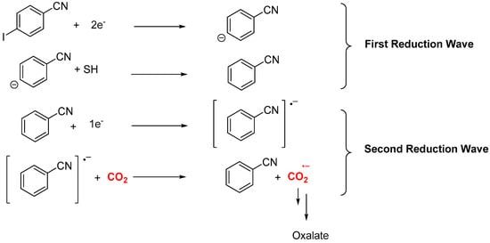 4-Iodobenzonitrile (1) showed a different electrochemical behavior at GC and silver cathodes in DMF under a CO2 atmosphere. When GC was used, two reduction peaks were observed at −1.83 V and −2.35 V, the first one corresponding to the electrochemical reduction of 1, and the second one to the electrochemical reduction of benzonitrile (Figure 4a). It is worth noting that in the presence of CO2 there was an increase in the peak current value of this second reduction peak and a loss of reversibility, which indicated that the benzonitrile was acting as an organic mediator for the reduction of CO2 through a homogeneous indirect catalytic process [41,42]. In the corresponding anodic counter scan, a new oxidation peak was observed at 0.45 V, which corresponded to the oxidation of the oxalate anion generated in the CO2 reduction process under a saturated CO2 atmosphere [43] (Scheme 3). Note that the peaks at higher oxidation potential values corresponded to the oxidation of iodide and triiodide, respectively. Due to the low oxidation potential value of silver, it was not possible to record any anodic counter scan so as to detect the nature of the anionic products formed.
