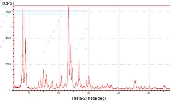 The physical and chemical properties of the obtained zeolites were studied by X-ray diffraction analysis and IR spectroscopy. The X-ray patterns of the obtained zeolites show the lines with the interplanar distances (d, Å): 11.05; 10.00; 4.29; 4.07; 3.87; 3.83; 3.73; 3.66; 3.45; 3.06; 2.99; 2.02, which are characteristic of the ZSM-5 type zeolite (Figure 1) [23]. Due to a small amount of ZnO and ZnS (1–5%) in the zeolite, the X-ray patterns of the zeolites modified by 1–5 wt. % ZnO and ZnS correlate with the pattern of the pure H-ZKE-AF zeolite.