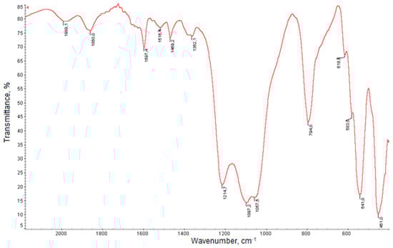 The IR spectra of the synthesized zeolites have intense absorption bands at 451, 541, 794, and 900–1300 cm−1 (Figure 2). The absorption band at 541 cm−1 corresponds to 5-rings in the zeolite framework and is characteristic of the ZSM-5 type zeolites. The strong absorption band at 1000–1200 cm−1 in the IR spectrum corresponds to the antisymmetric stretching vibrations of TO4 tetrahedra, the absorption band at 794 cm−1 refers to the stretching vibrations of SiO4 tetrahedra. According to the data of X-ray phase analysis and IR spectroscopy, the obtained zeolite samples in the decationized form of H-ZKE-AF refer to the microporous zeolites of the ZSM-5 type [23].