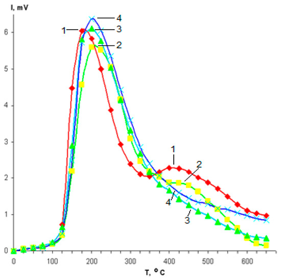 Thermal desorption spectrum of ammonia on H-ZKE-AF modified by 1–5% zinc sulfide: (1) pure H-ZKE-AF, (2) 1% ZnS additive, (3) 3% ZnS additive, (4) 5% ZnS additive.