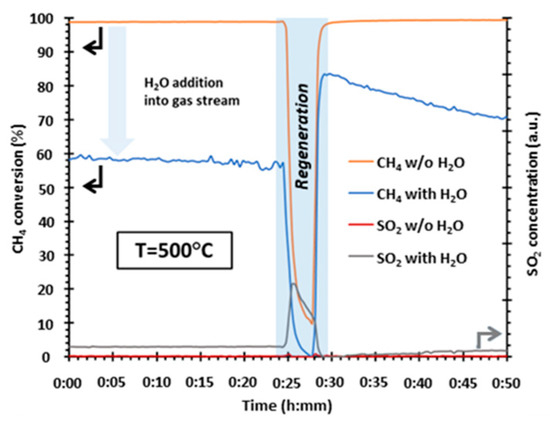 Regeneration of PdSO4/Al2O3 methane combustion model catalyst was studied under both dry and wet synthetic exhaust gas. Figure 1 shows CH4 conversion and SO2 concentration during the regeneration procedure with and without water vapor in the exhaust gas stream. In both cases, a decrease in CH4 conversion can be detected during the regeneration procedure, due to lack of O2 in the reaction gas feed. However, SO2 release and, thus, decomposition of sulfate can be detected only if water vapor is present in the exhaust gas stream. This is due to steam reforming and water–gas shift reactions [21,22], which provides H2 for the sulfate to decompose. Without water vapor in the exhaust gas stream, CH4 is the only reducing agent, and it is not as effective as H2. Decay in methane conversion after regeneration in the presence of water vapor is due to the loss of oxygen from the active PdO phase [23].