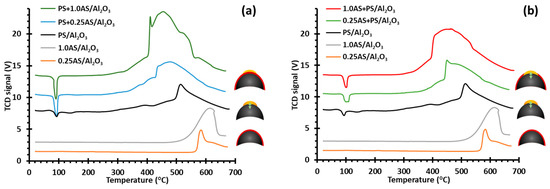 Thermal decomposition under hydrogen gas of (a) alumina-supported combined sulfates PdSO4 (PS) + 0.25 Al2(SO4)3 (AS)/Al2O3 and PS + 1.0 AS/Al2O3, and (b) alumina-supported combined sulfates 0.25 AS + PS/Al2O3 and 1.0 AS + PS/Al2O3 together with individual alumina-supported sulfates PS/Al2O3, 0.25 AS/Al2O3 and 1.0 AS/Al2O3. Experiments were carried out under 10% H2 in an argon gas atmosphere.