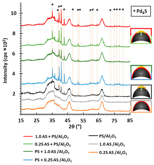 Temperature-programmed reduction (TPR), desorption (TPD), and oxidation (TPO) were used to clarify the decomposition of sulfur compounds. The TPR experiments were carried out under blended gas of 10% H2 and Ar. The thermal decompositions of Al2O3-supported PdSO4 (PS) and Al2(SO4)3 (AS) model catalysts individually and in combination under a hydrogen gas mixture are represented in Figure 3. Al2O3-supported PdSO4 decomposes at a lower temperature compared to individual supported Al2(SO4)3. Hydrogen consumption started around 250 °C, but no sulfur release was observed with a quadrupole mass spectrometer detector before the temperature range of 400–500 °C. The result is well in line with previous observations [26]. The decomposition of sulfate combinations began, however, at about a temperature of 100 °C lower than that for the individual one, and the amount of Al2(SO4)3 in the catalyst affected this directly—the higher the Al2(SO4)3 content, the lower the decomposition temperature. This may indicate that the presence of Al2(SO4)3 de-stabilizes PdSO4. One explanation could be the exothermic decomposition reaction of sulfates that promotes itself when the reaction proceeds. Moreover, the high overall sulfate content of the catalyst may decrease the support material effect and thus make the sulfates more like a bulk sulfate, which decomposes at a lower temperature than do support-material-stabilized sulfates. The elemental analysis results of the samples, tabulated in Table 1, showed that the sulfur content of each TPR-treated catalyst was 0.30 wt.% if PdSO4 was included in the catalyst. The residual sulfur content corresponds to the stoichiometric sulfur amount in the Pd4S structure. Powder X-ray diffraction (PXRD) measurements were recorded to confirm the Pd4S structure (Figure 4). Based on the PXRD results, if Al2(SO4)3 is present in the catalyst, more crystalline Pd4S is formed during TPR treatment. The result gives an indication that Pd4S may be one factor that is affecting catalyst regeneration.