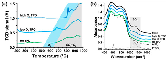 The thermal decomposition results for the PS/Al2O3 model catalyst in the absence of oxygen (He TPD), under low oxygen concentration (0.1% O2/He), and in excess oxygen (10% O2/He) are shown in Figure 5a. Two separate decomposition steps were observed in each case, as concluded in our previous study [27]. However, the first step of the PdSO4 decomposition reaction was observed to decay as a function of the oxygen concentration. The analysis relies on the mass signals of O2 and SO2 recorded during the thermal decomposition. It has also been suggested that in the absence of oxygen, sulfate species could decompose via a one-step mechanism [26]. The decomposition of Al2O3-supported PdSO4 was initiated at 600 °C in He gas, whereas the corresponding temperature under 10% O2/He was 800 °C. The oxygen concentration also affected the quantitative sulfur content—the lower oxygen concentration corresponded to better sulfur removal (Table 1) due to the longer time period at temperatures required for the decomposition. FTIR spectra of the PS/Al2O3 model catalyst recorded after different treatments (Figure 5b) supported the result as the relative intensity of the asymmetric stretching vibration of sulfate decays as the oxygen concentration of the gas mixture decreases.