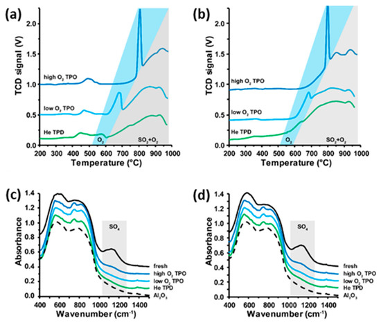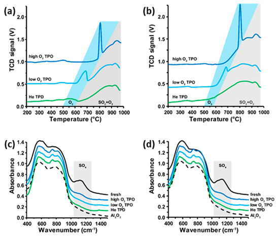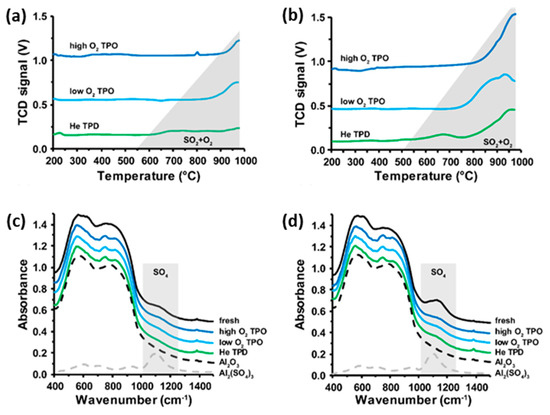 The formation of Al2(SO4)3 over an Al2O3-supported methane oxidation catalyst has been reported [9,10], and it is thus crucial to know its decomposition temperature relative to that of PdSO4 and, further, its role in the decomposition of PdSO4. The decomposition experiments for the bulk Al2(SO4)3 and AS/Al2O3 model catalysts were carried out as in the case of the PS/Al2O3 model catalyst under three different gas atmospheres. The unsupported bulk Al2(SO4)3 decomposed completely between 600 °C and 800 °C [28]. The thermal decomposition of Al2O3-supported Al2(SO4)3 under different gas atmospheres is shown in Figure 6a,b. The decomposition of Al2O3-supported Al2(SO4)3 took place at a higher temperature than did that of bulk Al2(SO4)3 or Al2O3-supported PdSO4. Overall, the trends in the decomposition temperatures of the bulk and supported Al2(SO4)3 showed strong support interaction. The decrease in the oxygen concentration of the feed gas resulted in higher removal of sulfur during the decomposition of supported Al2(SO4)3 based on FTIR data (Figure 6c,d) and quantitative sulfur analysis (Table 1). However, the removal of sulfur was evidently less than that in the case of the PS/Al2O3 model catalyst. It can be concluded that individual and Al2O3-supported Al2(SO4)3 is more stable than PdSO4, and the decomposition order of the supported sulfates is the same as that observed already in TPR, despite the gas atmosphere, even though the decomposition temperature under a hydrogen gas mixture is lower. Moreover, it is worth noting that the decomposition route of AS/Al2O3 was different from that of PS/Al2O3, as no O2 peak was observed before simultaneous release of O2 and SO2.