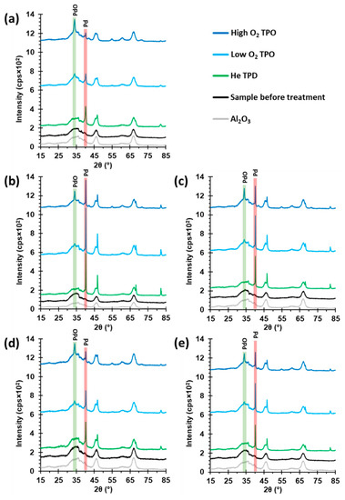 The powder X-ray results presented in Figure 9 reveal that a decrease in oxygen concentration in the feed gas resulted in a higher content of metallic palladium in the regenerated PS/Al2O3 model catalyst. The qualitative PdO and Pd peak areas and crystallite sizes are tabulated in Table 1. The decomposition of the PS/Al2O3 model catalyst under helium gas resulted in the formation of only metallic Pd. Earlier, Hoyos et al. [13] concluded that decomposition under an inert gas atmosphere led to PdO, although the presence of an active phase was not directly observed. Qualitatively powder X-ray diffraction results showed that if Al2(SO4)3 was present in the catalyst, a high content of metallic Pd was observed. This indicates that Al2(SO4)3 stabilized the metallic Pd phase and/or lead to sintering of metallic Pd particles, possibly prevented re-oxidation of metallic Pd to the active PdO form. Overall, the formation of metallic Pd is undesirable, because it is known to be inactive in low-temperature methane oxidation under lean-burn conditions and it is also known to be vulnerable to sintering [29,30,31]. Overall, a high oxygen concentration in the feed gas resulted in a prominent amount of PdO in the model catalyst after the thermal decomposition of the sulfate species, whereas a low oxygen concentration in regeneration led to a high metallic Pd content.