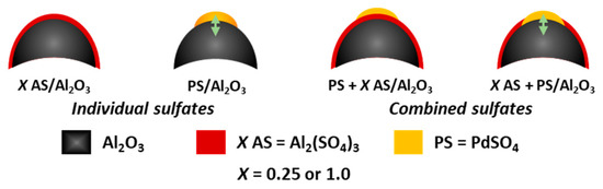 Alumina sulfate formation in various conditions and catalyst systems have been previously studied owing to its role in many catalytic reactions and processes [15,16]. However, there has been no systematic research about the stability of Al2O3-supported aluminum sulfate or its role in the decomposition of palladium sulfate. In addition, the literature concerning Al2O3-supported palladium sulfate or sulfur-poisoned methane combustion catalyst is limited to regeneration studies under different gas atmospheres and varying temperatures [13,17,18,19,20]. No systematic and quantitative knowledge about the stability of the supported sulfates and catalyst structure after decomposition is available.