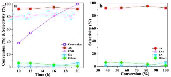 Then, the influence of Co loading was examined using Co/Pt/PAC catalyst that was selective to the formation of AS. The results collected by using Co/Pt values of 0.5, 1.0, and 2.0 are given in Table 2. Although a small added amount of Co (0.075 wt.-%) decreased the rate of NS conversion by a factor of about 2, the selectivity to AS was enhanced to 95% from 81% (entry 2). Further increase in the Co loading did not change the high AS selectivity but increased the catalytic activity (entries 3, 4). The rate of NS conversion with 0.30 wt.-% Co-loaded Pt/PAC was comparable to that with Co-unmodified Pt/PAC (entries 1, 4). The product selectivity with Co/Pt/PAC catalysts was not observed to change with the NS conversion. The time-selectivity-conversion relation measured for a selected catalyst of 0.075 wt.-% Co-loaded Pt/PAC catalyst is given in Figure 1.