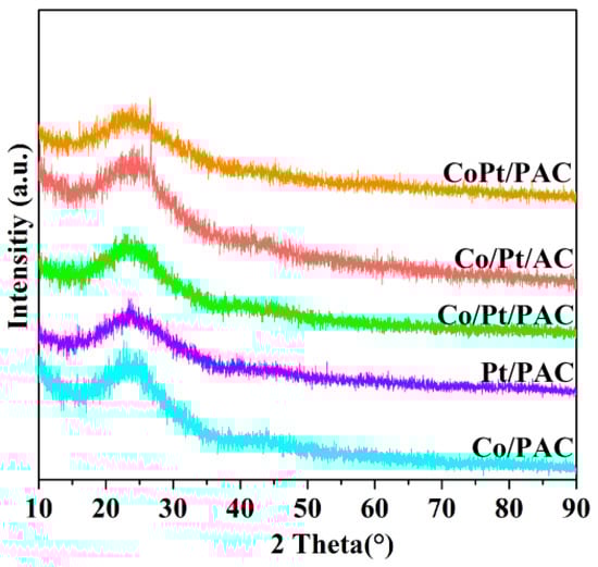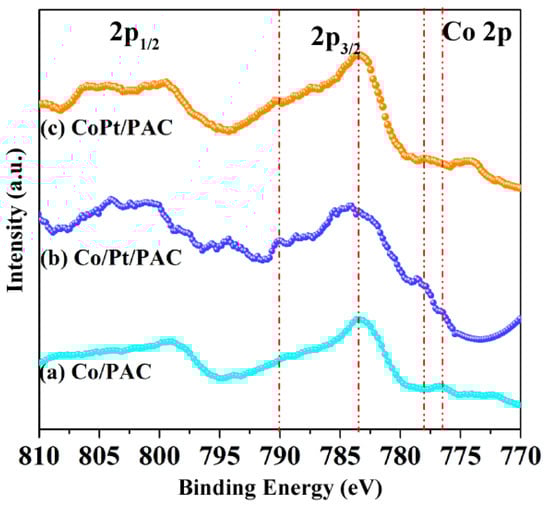 Next, the surface of PAC support and Co-modified and unmodified Pt catalysts on PAC was examined by XPS. Co 2p XPS profiles of monometallic catalysts Co/PC, bimetallic catalysts Co/Pt/PAC and CoPt/PAC catalysts are shown in Figure 5. The Co 2p3/2 peaks of these two samples were close to 784.0 eV, indicating that the surface Co was mainly in the oxidation state of Coδ+, possibly in the form of CoOx and Co(HPO3H)2 [55], which was related to the re-oxidation of the reduced Co in air. In the case of Co/Pt/PAC, the peak at a higher binding energy of 788.7 eV was assigned to Co2+ satellite peak in the oxidized state [56]. The binding energy of about 777.3 eV was attributed to CoPOx species [53,55]. In addition, only a very weak signal at 778.6 eV assigned to Co0 was detected on the Co/Pt/PAC catalyst (Co/Pt = 2), but it was absent in the monometallic catalyst Co/PAC. Furthermore, compared with Co/PAC, the signals of Co/Pt/PAC shifted to a higher binding energy area but no binding energy shift for CoPt/PAC. The electronic states of Co indicated that almost all the Co species existed in oxidation states other than metallic states in the monometallic and bimetallic catalysts. Noteworthy, almost no Pt signal can be detected in the XPS of the Co/Pt/PAC and CoPt/PAC catalysts due to the small Pt loading and coverage of Pt with Co species.