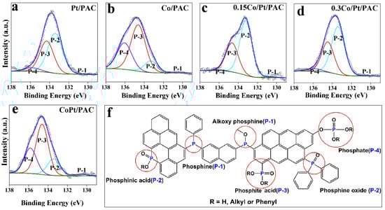 P 2p XPS spectra of Pt/PAC (a), Co/PAC (b), 0.15 wt.-% Co-modified Pt/PAC (c), 0.30 wt.-% Co-modified Pt/PAC (d), CoPt/PAC (e) (Co loading was 0.15 wt.-%), and (f) Types of P-containing functional groups in the activated charcoal.