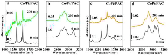 In-situ diffuse reflectance infrared Fourier transform spectroscopy (DRIFTS) adsorption spectra of NS over Co/Pt/PAC (a,b) and CoPt/PAC (c,d). (Pt loading was 0.50 wt.-% and Co loading is 0.15 wt.-%).