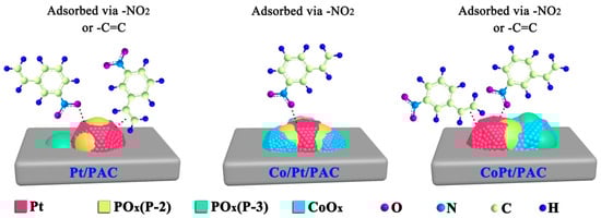 Possible structures of Pt/PAC, Co/Pt/PAC and CoPt/PAC catalysts and different modes of adsorption of NS on their metal particles. (Red: Pt, Yellow: POx (P-2), Green: POx (P-3), Blue:CoOx).