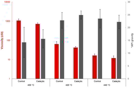 Figure 4 presents the yield of the different products obtained from the catalytic and non-catalytic cracking of Athabasca bitumen, and Figure 5 presents quality measurements of the centrifuged liquid product at 400 °C, 420 °C and 440 °C. At 400 °C, almost no coke is formed for either control or catalytic runs resulting in 95.0 ± 4.7 wt.% and 93.5 ± 5.5 wt.% liquid product, respectively. However, while the viscosity is significantly reduced from the feed for both runs, 1100 ± 230 cSt and 720 ± 100 cSt, respectively, it is well over the 350 cSt requirement for pipelines. Additionally, °API gravity improvement is only 1–2 points from the feed for both control and catalytic runs. Thus, while the yields are encouraging, either the residence time or the severity of the reaction must be increased to further reduce the viscosity. A higher residence time could be employed, however, for the sake of partial upgrading, where the main objective is to obtain transportable crude, residence times should ideally be kept short in order to minimize reactor volumes.