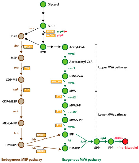 Biosynthetic pathway of (−)-α-bisabolol in engineered E. coli. The endogenous MEP) pathway consists of DXS (deoxyxylulose-5-phosphate synthase), DXR (deoxyxylulose 5-phosphate reductoisomerase), CMS (2-C-methylerythritol 4-phosphate cytidyl transferase), CMK (4-(cytidine 5′-diphospho)-2-C-methylerythritol kinase), MDS (2-C-methylerythritol 2,4-cyclodiphosphate synthase), HDS ((E)-4-hydroxy-3-methylbut-2-enyl diphosphate reductase), and HDR (hydroxymethylbutenyl diphosphate reductase). The MEP pathway begins with the condensation of G-3-P (glyceraldehyde 3-phosphate) and pyruvate that is converted from G-3-P by endogenous nicotinamide adenine dinucleotide (NAD+)-dependent GAPDH (glyceraldehyde-3-phosphate dehydrogenase) coded by gapA and nicotinamide adenine dinucleotide phosphate (NADP+)-dependent GAPDH coded by gapC from Clostridium acetobutylicum (C. acetobutylicum). The exogenous MVA pathway consists of MvaE (dual function of acetoacetyl-CoA thiolase and 3-hydroxy-3-methylglutaryl-CoA reductase), MvaS (3-hydroxy-3-methylglutaryl-CoA synthase), MvaK1 (MVA kinase), MvaK2 (phosphomevalonate kinase), MvaD (mevalonate 5-pyrophosphate decarboxylase), Idi (isopentenyl diphosphate isomerase), IspA (geranyl diphosphate synthase or FPP synthase), and MrBBS ((−)-α-bisabolol synthase of Matricaria recutita). Endogenous and exogenous genes are depicted in brown and green, respectively.