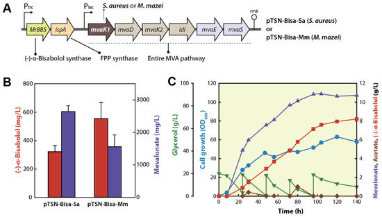 To avoid feedback inhibition of MvaK1 and subsequently improve (−)-α-bisabolol production, we replaced the S. aureus mvak1 gene of the pTSN-Bisa-Sa plasmid with a feedback-resistant mvaK1 gene (Figure S1) from the versatile methanogen M. mazei, which resulted in a pTSN-Bisa-Mm plasmid. The E. coli DH5α-pTSN-Bisa-Mm strain produced 555 mg/L of (−)-α-bisabolol, which is 1.7-fold higher than that of the E. coli DH5α-pTSN-Bisa-Sa strain (Figure 2B). This is consistent with MVA accumulation of MmMvaK1 showing 1.7-fold less than that of SaMvaK1 (Figure 2B, right panel), suggesting that the feedback-resistant MmMvaK1 leads to an increase the MVA utilization efficiency.