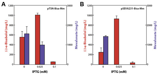Effect of IPTG on (−)-α-bisabolol production. The concentrations of (−)-α-bisabolol and MVA produced by the E. coli DH5α harboring pTSN-Bisa-Mm, a high-copy plasmid (A) or pSEVA231-Bisa-Mm, a medium-copy plasmid (B). Cells were grown in TB medium containing 10 g/L glycerol and 20% (v/v) of n-dodecane in the presence of different IPTG concentrations (0, 0.025 and 0.1 mM) at 30 °C for 72 h. The error bars represent the standard deviation of the concentrations of (−)-α-bisabolol and MVA from three biological replicates.