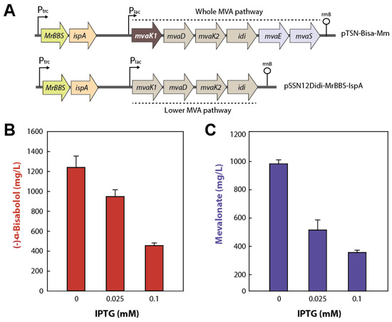 Considering the high accumulation of MVA in the production of (−)-α-bisabolol, we reinforced the whole MVA pathway through the expression of an additional copy of lower MVA pathway genes. A newly generated plasmid, pSSN12Didi-MrBBS-IspA, contains the lower MVA pathway genes (mvaK1, mvaK2, mvaD, idi), MrBBS, and ispA (Figure 4A). The MvaK1 of pSSN12Didi-MrBBS-IspA plasmid was adopted from Streptococcus pneumoniae (S. pneumoniae), which has a 2.6-fold faster turnover number (kcat) than that of MmMvaK1 [17]. In the absence of IPTG, E. coli DH5α harboring both pTSN-Bisa-Mm and pSSN12Didi-MrBBS-IspA plasmids produced 1.2 g/L of (−)-α-bisabolol and 988 mg/L of MVA (Figure 4B,C), which are 2.2-fold higher and 1.4-fold lower than those of the E. coli DH5α containing the pTSN-Bisa-Mm plasmid alone, respectively. Because the metabolic flux was changed by the introduction of additional lower MVA pathway genes, we probed the effect of IPTG concentrations on the (−)-α-bisabolol production in the E. coli DH5α containing both pTSN-Bisa-Mm and pSSN12Didi-MrBBS-IspA plasmids. Unlike the results from the E. coli DH5α harboring the pTSN-Bisa-Mm alone (Figure 3A), production of both (−)-α-bisabolol and MVA decreased as the IPTG concentrations increased (Figure 4B,C), indicating that enzymes for (−)-α-bisabolol biosynthesis were sufficiently expressed in the absence of IPTG to increase the (−)-α-bisabolol production when the lower MVA pathway was reinforced.