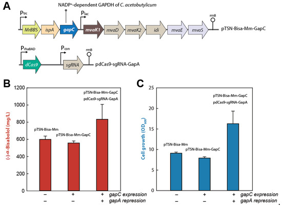 Overexpression of gapC gene encoding NADP+-dependent GAPDH from C. acetobutylicum and repression of gapA gene coding for endogenous NAD+-dependent GAPDH from E. coli using the CRISPRi system. (A) Plasmid constructs for expressing genes of the entire (−)-α-bisabolol biosynthetic pathway introducing the gapC gene downstream of the ispA gene (pTSN-Bisa-Mm-GapC) and for expressing inactivated Cas9 (dCas9) and sgRNA targeting the gapA gene (pdCas9-sgRNA-GapA). (B) Comparison of (−)-α-bisabolol concentrations produced by the E. coli DH5α harboring pTSN-Bisa-Mm, pTSN-Bisa-Mm-GapC, or both pTSN-Bisa-Mm-GapC and pCas9-sgRNA-GapA. (C) Comparison of cell growth of the strains. Cells were grown in TB medium containing 10 g/L glycerol and 20% (v/v) of n-dodecane in the presence of different IPTG concentrations (0, 0.025 and 0.1 mM) at 30 °C for 72 h. The error bars represent the standard deviation of the concentrations of (−)-α-bisabolol and OD600 from three biological replicates.