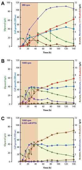 We performed a fed-batch fermentation to produce the (−)-α-bisabolol in E. coli DH5α containing both pTSN-Bisa-Mm and pSSN12Didi-MrBBS-IspA plasmids. The yield of (−)-α-bisabolol was improved by 16% in 46 h compared to when the lower MVA pathway was not additionally overexpressed. However, the MVA still accumulated from the beginning of fermentation and reached 10.1 g/L in 68 h at 280 rpm despite reinforcing the lower MVA pathway (Figure 6A). It seems that there are other bottlenecks when MVA is converted to (−)-α-bisabolol through the lower MVA pathway. The synthetic MVA pathway requires 3 moles of ATP to convert MVA to (−)-α-bisabolol (Figure 1) and competes for the ATP with other essential cellular reactions involved in cell growth [18]. Because ATPs are efficiently generated under aerobic conditions using NADHs in oxidative phosphorylation [19], aeration effects were examined by controlling the agitation speed in fed-batch fermentation.