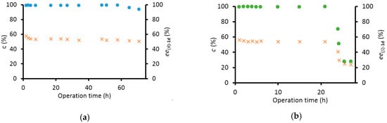 Long-term stability of the most efficient (S)-selective (ArS-TA) and (R)-selective (AtR-TA) immobilized TA biocatalysts in preparative scale continuous-flow kinetic resolution of rac-1d with (a) immobilized ArS-TA; and (b) immobilized AtR-TA [conversion (×), ee(R)-1d (●) and ee(S)-1d (●)].