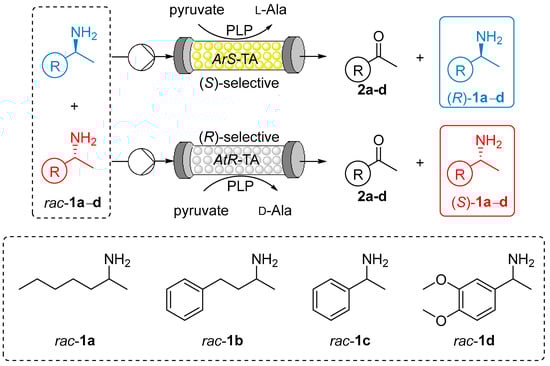 2.2.2. Kinetic Resolution of Amines rac-1a–d with Immobilized TA Biocatalysts in Continuous-Flow Mode