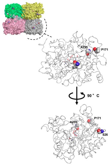The aminoacid residues mutated in the Saccharolobus solfataricus (Ssβ-Gly) H7 enzyme. The position of S26, P171, and A235 residues (in spherical format) are shown on the tetrameric and monomeric 3D structures of Ssβ-Gly, represented in ribbon format. Catalytic residues in the active site are highlighted in ball and stick format, and all atoms are colored by the CPK convention.