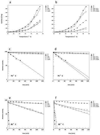 Thermal activity and stability of Ssβ-Gly H7 and relative single and double mutants. The dependence on temperature of the wild type is compared with the H7 mutant; single (a) and double mutants (b). Similarly, the residual activity at 75 °C and 85 °C of the wild type, in comparison with H7 mutant, single (c,e) and double mutants (d,f), is reported. Ssβ-Gly (closed circles on dotted line); Ssβ-Gly H7 (closed squares); L26 (open triangles); L171 (open squares); V235 (open diamonds); L26/L171 (open triangles); L26/V235 (open squares); L171/V235 (open diamonds).