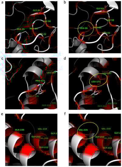 Ssβ-Gly 3D structure in comparison with the H7 mutant model. Close-up of Ssβ-Gly wild type structure (PDB ID: 1GOW) (a,c,e) and Ssβ-Gly single mutations in the H7 mutant, S26L, P171L, and A235V in (b,d,f), respectively. The hydrophobic residues are indicated in red. The mutant residues are highlighted in yellow.