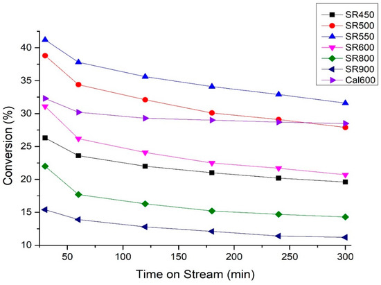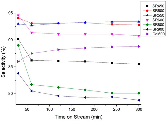 As shown in Figure 2, the propylene selectivity values determined after 1 h were in the order of SR500 > SR550 > SR600 > Cal600 > SR450 > SR800 > SR900. Similar to the trends in Figure 1, the selectivity values of SR500 and SR550 were similarly high until 180 min, after which SR550 showed slightly superior selectivity to SR500 until 5 h reaction time. As mentioned, the direct reduction method was first reported by Deng and coworkers [10,21]. They prepared Pt–Sn/SiO2 catalysts and evaluated the effects of the direct reduction method. On comparison with the activity of a conventionally calcined catalyst, they observed higher activity after direct reduction at 800 °C. However, because we are considering commercial applications, in our study, an Al2O3 support was chosen. Al2O3 is more favorable than SiO2 because Al2O3 is durable and more stable under the high temperature conditions of the PDH reaction. The main objective of this study was to verify whether Pt–Sn/Al2O3 prepared by a direct reduction will show similar superiority to the conventional catalyst for the PDH reaction.