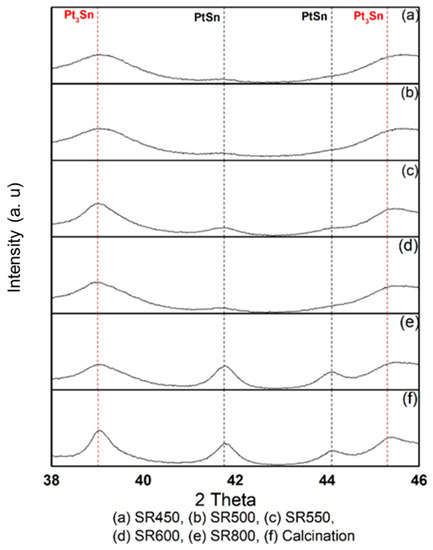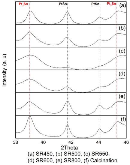 Figure 3 shows the XRD patterns of the five SR catalysts (SR450, SR500, SR550, SR600, and SR800) and the Cal600 catalyst. As shown in Figure 3, two different alloys, PtSn and Pt3Sn, were detected between 38° and 46° in 2θ. The peaks located at 2θ values of 41.71° and 44.01° are related to the PtSn alloy, and the peaks located at 2θ values of 39.16° and 45.51° correspond to the Pt3Sn alloy [10,21]. It has been reported that the Pt3Sn alloy is only formed when precursor’s molar ratios of Pt/Sn is higher than 1 [21]. In this study, both PtSn and Pt3Sn are clearly indicated by the XRD patterns. The precursor ratio was fixed to 3 to 1.8 by weight (1:1 by mole). Interestingly, the SR catalysts showed a slight shift to a higher angle in the characteristic Pt3Sn peak near 45°. Here, we infer that the PtxSny (x/y >3) alloy is possibly formed, and a small amount of Sn can be excluded from the existing Pt3Sn alloy phase, as reported previously [10,21]. After reduction (Figure 4), the characteristic peaks of the PtSn alloy are not present in the XRD patterns of SR450, SR500, SR550, and SR600, although they were observed in the XRD pattern of SR800. As shown in Figure 4, the intensities of the characteristic peaks of PtSn alloy were reduced as the reduction temperature increased from 450 to 550 °C, and the peaks grew sharper as the reduction temperatures increased from 600 to 800 °C. Considering the results of the catalytic activity tests and the XRD analysis, we inferred the presence of PtSn alloy, which must affect the PDH reaction negatively. Meanwhile, the intensities of the characteristic peaks of the Pt3Sn alloy did not change much with increasing direct reduction temperature. The characteristic Pt3Sn peak shifted slightly to the characteristic peaks of PtxSny (x/y > 3) near 45.5°. Conceivably, the abundant Pt in Pt3Sn or PtxSny (x/y > 3) provides more active sites for the PDH reaction. Thus, the activity for the PDH reaction was increased not by the increasing amount of PtSn alloy but the increasing amount of Pt3Sn or PtxSny (x/y > 3) alloy. In addition, the presence of broad peaks in the XRD patterns implies that the Pt3Sn alloy is more amorphous or dispersed and nano-sized [21]. In the case of Cal600, the characteristic peaks of both PtSn and Pt3Sn alloys were very sharp, as shown in Figure 4f. Thus, both Pt3Sn and PtSn alloys are highly crystalline in the Cal600 catalyst. Therefore, even though Pt3Sn alloy in Cal600 was present as a highly crystalline phase with large particle sizes, the presence of the PtSn alloy negatively affected the PDH reaction. After the PDH reaction, we found that the XRD peaks maintained similar peak intensities, as shown in Figure 4.