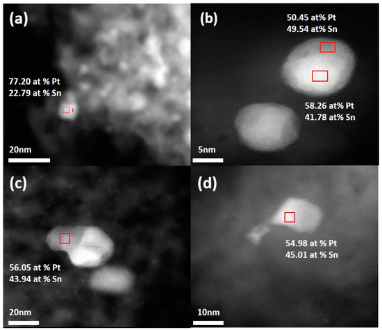 In Figure 6, EDS analyses of the SR550 and Cal600 catalysts are shown. Figure 6a shows the atomic percentages of Pt and Sn in SR550 catalyst (77.20 at.% Pt and 22.79 at.% Sn), which are close to the percentages of Pt and Sn in Pt3Sn alloy. In the case of the Cal600 catalyst, the atomic percentages (56.05 at.% Pt and 43.94 at.% Sn) are close to those of the PtSn alloy. Interestingly, different amounts of Pt in SR550 were observed at the edge as well as in the core of a metal alloy particle as shown in Figure 6b. Pt contents were 50.45 at.% at the edge and 58.26 at.% in the core of a metal (alloy) particle.