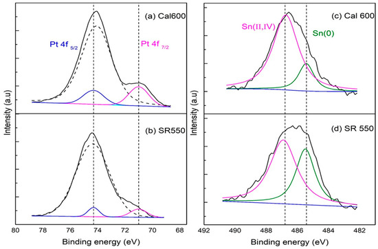 XPS Pt 4f spectra of (a) SR550, (b) Cal 600 and Sn 3d spectra of (c) SR550, and (d) Cal 600.
