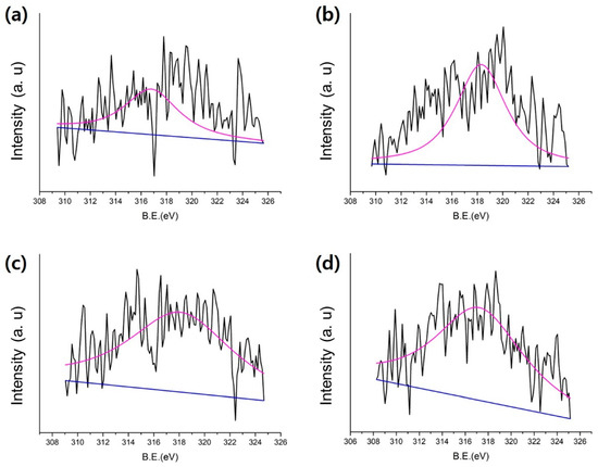XPS Ar sputter profile Pt 4d spectra of (a) SR550 6s, (b) SR550 18s, (c) Cal600 6s, and (d) Cal600 18s (B.E. = binding energy).