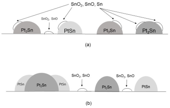 In Figure 10, hypothetical models of the catalyst dispersion are shown. In the case of the Cal600 catalyst, the large metal alloy particles are dispersed over the support, which may be covered with Sn and/or SnO2. Meanwhile, smaller alloy particles and a support only partly covered with SnO2 is shown for the SR550 catalyst. Based on Figure 8, the population of Pt3Sn alloy particles may be greater in the SR550 catalyst. In addition, metallic Sn could be present on the alloy surface. We have interpreted the presence of zero-valent Sn in Figure 8B as evidence of both Sn in alloys and isolated Sn particles.