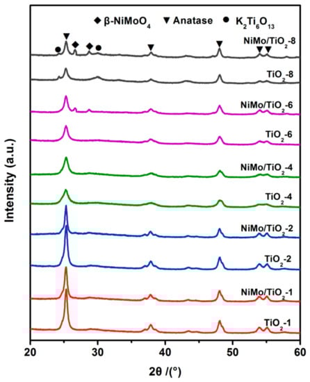 Figure 1 shows XRD patterns of various TiO2 supports and their corresponding NiMo/TiO2 catalysts. All samples almost show the same obvious peaks at 25.3°, 37.8°, 48.1°, 53.9°, and 55.1°, which are ascribed to (101), (103), (004), (112), and (200) planes of anatase crystal phase, respectively [34]. This indicates that the pH value of the ion exchange and loading process of Ni and Mo could not influence the main crystal phase of TiO2 support. In comparison, the intensities of diffraction peaks ascribed to the anatase phase are relatively weakened by the increasing pH value of supports and catalysts. The crystal phase size of anatase TiO2 of various samples is calculated according to the Scherer equation and their corresponding results are summarized in Table 1. The titania with a higher pH value has a relatively smaller crystal particle size. Moreover, there are two weak peaks at 23.9° and 29.8° observed in NiMo/TiO2-8 and TiO2-8, which correspond to the diffraction pattern of potassium hexatitanate [35,36]. This demonstrates the formation of potassium hexatitanate in NiMo/TiO2-8 and TiO2-8 under a high pH value of ion exchange. As also shown in Table 1, the potassium content of TiO2 is increased as the pH value increases. Among them, TiO2-6 and TiO2-8 are obviously higher potassium content than those of other TiO2.
