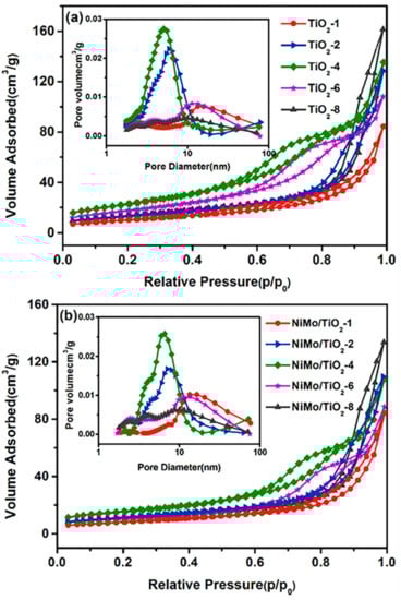 Nitrogen adsorption–desorption isotherms and pore size distributions of samples are shown in Figure 3. All the supports and catalysts show typical type IV adsorption isotherms with a noticeable hysteresis loop. This indicates the presence of mesoporous structures in all samples, as is also demonstrated by their pore-size distribution patterns [44,45]. Further, it can be observed from Figure 3a that TiO2 with different pH values have remarkably different shapes of hysteresis loops. TiO2-2 and TiO2-4 have a combination of H1 and H3 types of hysteresis loop. Type H1 is the characteristic of mesoporous materials having uniform nearly cylindrical channels, whereas H3 hysteresis is frequently associated with particle aggregations or slit-shaped pores with non-uniform size [44]. By contrast, the TiO2-n (n = 1, 6, 8) supports nearly exhibit typical H3-type hysteresis loops at relatively high pressure (0.8 < P/P0 < 0.99), which indicates that three TiO2 have slit-shaped mesoporous structures [44]. After adding Ni and Mo, nitrogen adsorption–desorption isotherm of the catalysts still have similar shapes to those of their corresponding supports. This indicates that the incorporation of Ni and Mo species could not remarkably influence the porous structure of TiO2, which could also reflect the good dispersion of Ni and Mo species.