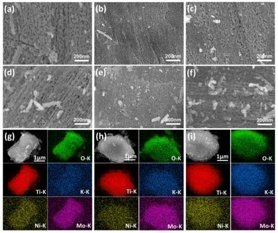 FESEM images of representative catalysts with different potassium content and their corresponding supports: (a) TiO2-1, (b) TiO2-2, (c) TiO2-6, (d) NiMo/TiO2-1, (e) NiMo/TiO2-2, and (f) NiMo/TiO2-6. EDS mapping images of catalysts: (g) NiMo/TiO2-1, (h) NiMo/TiO2-2 and (i) NiMo/TiO2-6.