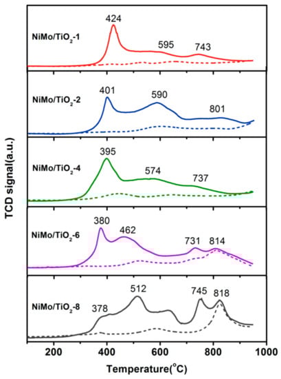 Oxidized molybdenum and nickel species need to be reduced into the sulfided ones under a presulfidation process, which are the main active species in an HDS reaction [49]. Hence, the reducibility of the active phase is an important factor for influencing HDS performance of catalysts. H2-TPR patterns as shown in Figure 5, different catalysts show significantly varying reduction processes. Generally, the reduction of oxidized molybdenum and nickel species on TiO2 experience three main stages. The first stage below 450 °C is ascribed to the reduction of Mo6+ to Mo4+ of octahedral Mo species. Subsequently, the second one contains the reduction of oxidized nickel species and superficial Ti4+, which usually occurs at 500–600 °C. Finally, the reduction of Mo4+ to Mo0 of octahedral Mo species and Mo6+ to Mo4+ of tetrahedral Mo species are carried out in the last stage at above 700 °C [50,51,52]. Apparently, TPR patterns of NiMo/TiO2-1, NiMo/TiO2-2, and NiMo/TiO2-4 show three above-mentioned reduction processes, which demonstrates the presence of corresponding forms of Mo and Ni-oxygen species. In comparison, the reduction process of NiMo/TiO2-6 and NiMo/TiO2-8 are relatively more complex compared with that of NiMo/TiO2 catalysts with low potassium content. Both NiMo/TiO2-6 and NiMo/TiO2-8 have a new reduction peak at above 800 °C, which is related to the reduction of TiO2-6 and TiO2-8 rather than that of Ni and Mo species. Additionally, the first and second reduction stage of NiMo/TiO2-6 and NiMo/TiO2-8 are obviously different from those of catalysts with low pH values. Jose, A., Rodriguez, et al., found that NiMoO4 phase was easier to be reduced than pure MoO3 [53]. Thus, decrease in reduction temperature of NiMo/TiO2-6 and NiMo/TiO2-8 could be attributed to the existence of NiMoO4 phase.