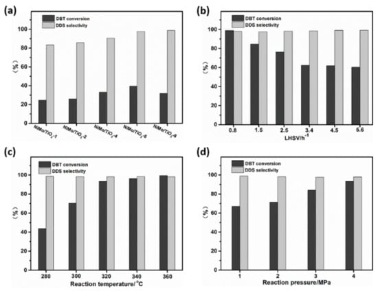 DBT conversion and direct desulfurization pathway (DDS) selectivity of (a) different NiMo/TiO2 catalysts (0.33 g catalyst, 300 °C, 2 MPa, LHSV of 5.6 h−1, H2/oil ratio of 606), (b) NiMo/TiO2-6 catalyst at various LHSV values (0.75 g catalyst, 300 °C, 2 MPa, LHSV of 0.8–5.6 h−1, H2/oil ratio of 606), (c) NiMo/TiO2-6 catalyst at various reaction temperatures (0.75 g catalyst, 280–360 °C, 2 MPa, LHSV of 5.6 h−1, H2/oil ratio of 606), (d) NiMo/TiO2-6 catalyst at various reaction pressures (0.75 g catalyst, 300 °C, 1–4 MPa, LHSV of 5.6 h−1, H2/oil ratio of 606).