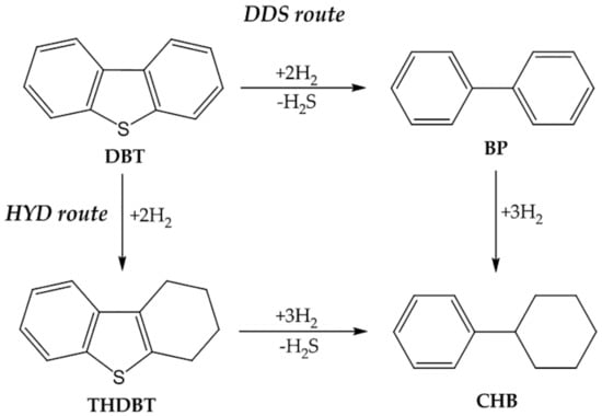 Driven by increasingly strict environmental requirements, the production of high-quality low sulfur fuels has become an urgent task [1,2,3]. To date, hydrodesulfurization (HDS) has been a general industrial technology for fuel oil desulfurization. The sulfur-containing compounds, e.g., dibenzothiophene (DBT), are usually catalytically removed through two main reaction pathways (as seen in Scheme 1: (i) direct C-S bond cleavage (the so-called direct desulfurization pathway, DDS), yielding the corresponding biphenyl (BP) product; (ii) initial hydrogenation followed by C-S bond rupture (the hydrogenation pathway, HYD), yielding first tetrahydrodibenzothiophene (THDBT) and then the corresponding cyclohexylbenzene product (CHB) [4,5]. The DDS pathway has an advantage in having less hydrogen consumption for desulfurization. Simultaneously, the DDS pathway is beneficial for achieving relatively high unsaturated hydrocarbon content of oil for improving their antiknock performance [6]. Therefore, it is of industrial importance to accomplish both superior hydrodesulfurization efficiency and high DDS selectivity.