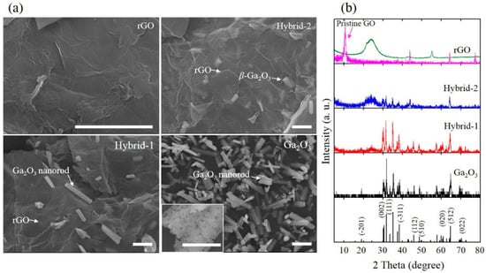 (a) FESEM images of rGO, Hybrid-2, Hybrid-1 and Ga2O3 (the scale bar is 3 μm); the scale bar of the inset is 1 μm), and (b) XRD patterns of the pristine GO, rGO, Hybrid-2, Hybrid-1 and Ga2O3 with the reference from Joint Committee on Powder Diffraction Standards (JCPDS) card no. 760573 (monoclinic Ga2O3 phase).