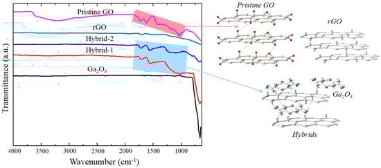 FTIR spectra of pristine GO, rGO, Hybrid-2, Hybrid-1 and Ga2O3, along with schematic chemical structure of GO, rGO and Ga2O3-rGO hybrids.