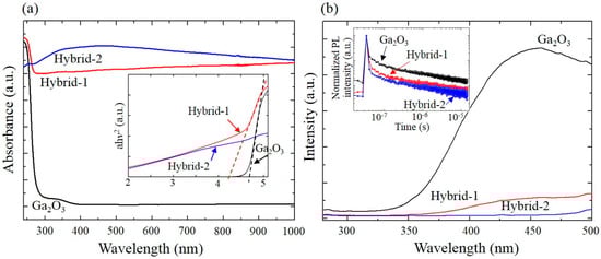 (a) UV-Vis-NIR spectroscopy and (b) PL spectroscopy of Ga2O3 and Ga2O3-rGO hybrids at room temperature. The inset in Figure 3a shows a Tauc plot, which is one method of extracting an optical energy bandgap in semiconductors. The inset in Figure 3b shows the normalized PL decay of the Ga2O3 and Ga2O3-rGO hybrids, which was measured at the emission wavelengths of 455 nm and 459 nm, respectively.
