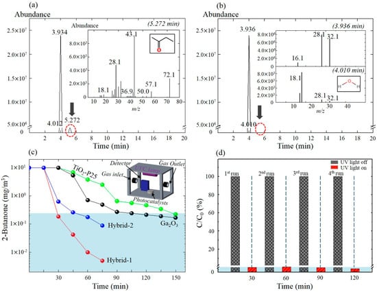 The identification of the adhesive component was measured with a GC-MS analysis, which was identified by comparing retention times and mass spectra with library spectra. Figure 4a shows that air, water and 2-butanone were detected before the photodegradation. After UVC irradiation of the 2-butanone for 30 min using a Ga2O3-rGO hybrid (Figure 4b), it was found that air and water were the main by-products. Figure 4c shows the degradation of 2-butanone as a function of exposure time under the 254 nm UVC irradiation time, at intervals of 30 min when different catalysts were used. The TiO2-P25, which is known to be a good photocatalyst, was also compared with its counterparts under the identical reaction conditions. With conventional TiO2-25, the 2-butanone degraded to 62% within 1 h. On the other hand, the 2-butanone degraded to 93% within 1 h when Ga2O3 was used as a catalyst. The hybrids showed a much-enhanced photodegradation efficiency compared to the Ga2O3 and TiO2. The 2-butanone degraded to 99.9% and 98.2% under the identical conditions when Hybrid-1 and Hybrid-2 were used, respectively. The additional rGO in the Ga2O3 played a role as a transfer pathway of the photo-generated carriers. In addition, the rGO provided a much higher specific surface area, improving the photocatalytic performance of the Ga2O3. It was found that Hybrid-1 had a higher specific surface area (SBET = 149 m2·g−1) than the pure Ga2O3 (SBET = 3.4 m2·g−1) and Hybrid-2 (SBET = 36 m2·g−1), using the Brunauer–Emmett–Teller (BET) surface area measurement [42,43]. While the additional rGO in the Ga2O3 improved the photocatalytic performance via the reasons above mentioned, it adversely degraded the photocatalytic performance due to the lower UVC absorption blocked by excessive rGO [20,34], which could be observed in Figure 3a. This explained the experimental results; the degradation performance of different catalysts was in the order of Hybrid-1 (1 wt. % of rGO) > Hybrid-2 (5 wt. % of rGO) > Ga2O3 > TiO2-P25. In addition to the photocatalytic activity, the stability and repeatability of the 2-butanone degradation was investigated using Hybrid-1, with the results shown in Figure 4d. The results showed that Hybrid-1 retained its photocatalytic activity even after prolonged operation.